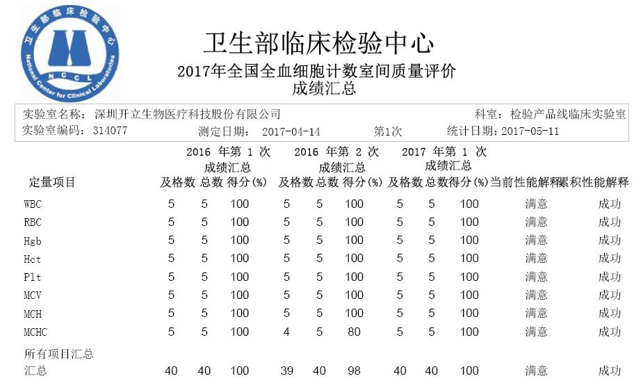 近日,国家卫生部临床检验中心公布了《2017年全国全血细胞计数室间质量评价活动》结果报告。太阳成tyc7111cc官网医疗以全部满分的结果通过了此次室间质评。